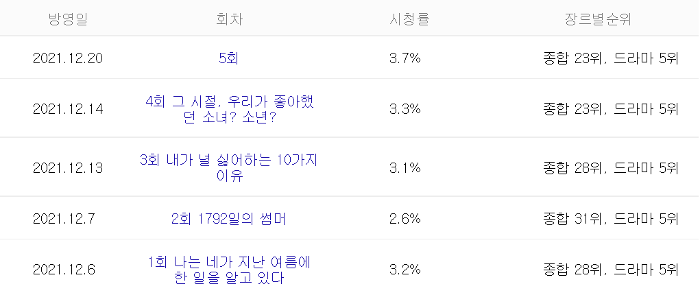그럭저럭 무난한 출발이 아닌가 싶은데요. 아무래도 유명 배우가 출연하는 작품이 아닌 신인급 배우들 중심으로 만든 드라마라서 이 정도 시청율로 출발한 게 아닌가 싶네요. 그래도 점점 더 좋은 평가를 받기를 기대해 봅니다. 최신 시청율에 대해서는 아래를 참조하세요.