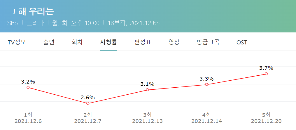 시청률 조사회사인 닐슨코리아에 따르면 12월 6일 첫 방송된 SBS 새 월화 드라마 그해 우리는의 첫화는 전국 가구 가준 시청율 평가에서 3.2%를 기록했습니다.