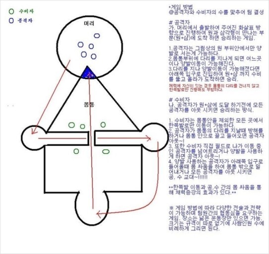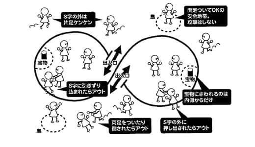 이 오징어 게임의 원형으로 추정되는 것은 일본의 S켕(Sけん)이라는 어린이들 놀이라고 하는데요. S자로 두 편이 진영을 나눠서 자기 진영 안에서는 두 발로, 자기 진영 밖에서는 한 발, 즉 깽깽이로 움직이면서 상대 진영의 머리 부분에 있는 보물을 뺏는 게임인 것이죠. 아래 사진을 보시면 S켕이 나옵니다.