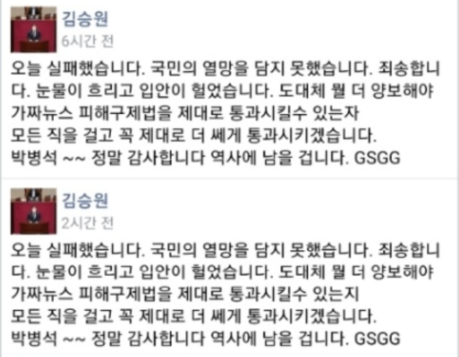 자, 아래의 그림을 보시면, 김승원 국회의원이 처음에 GSGG를 넣어서 작성한 글과, 논란이 일자 GSGG를 빼고 고친 글입니다. 좌/우에 GSGG가 있고, 없고의 차이가 있죠?